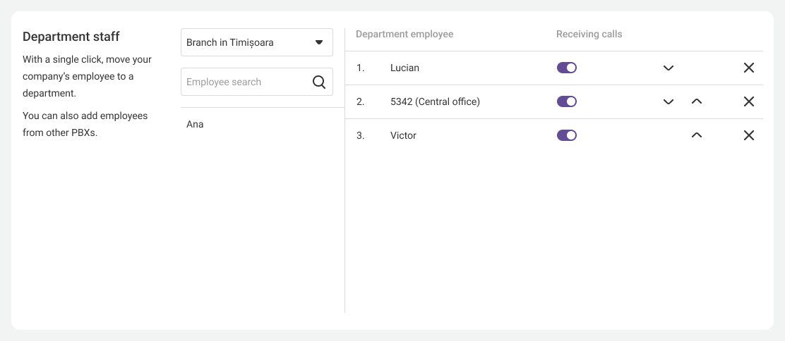 4. You can change the order in which employees from other PBXs receive calls, temporarily exclude them from this queue or completely remove them from the department, just like any other Сloud PBX employee.