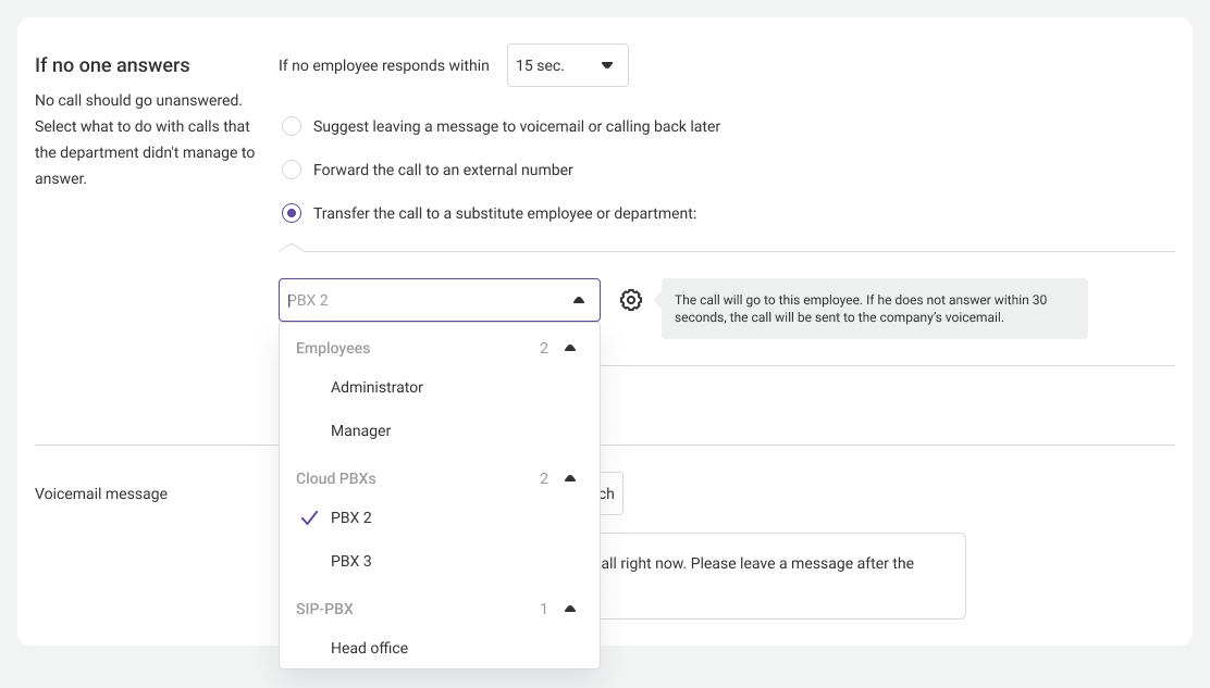 When department employees don’t answer within a certain amount of time, the call can be transferred to a substitute employee or department. To do this, in the department settings in the If no one answers section, you need to select Forward the call to a department or a substitute employee. To use an employee from another PBX as a substitute one, specify another PBX in the drop-down list.