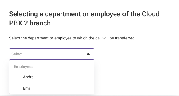 In the pop-up window, select where the call will be transferred to: a department or an employee of another PBX.