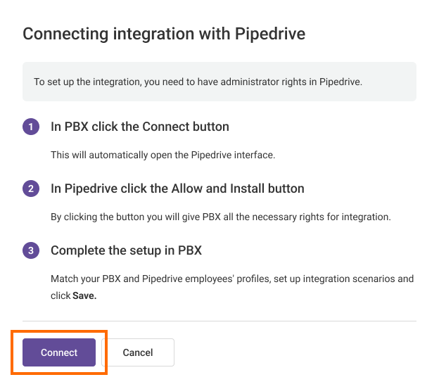 1. In your Cloud PBX, go to the Settings section and open the CRM Integration menu. Find the Pipedrive widget, click Connect and follow the instructions.