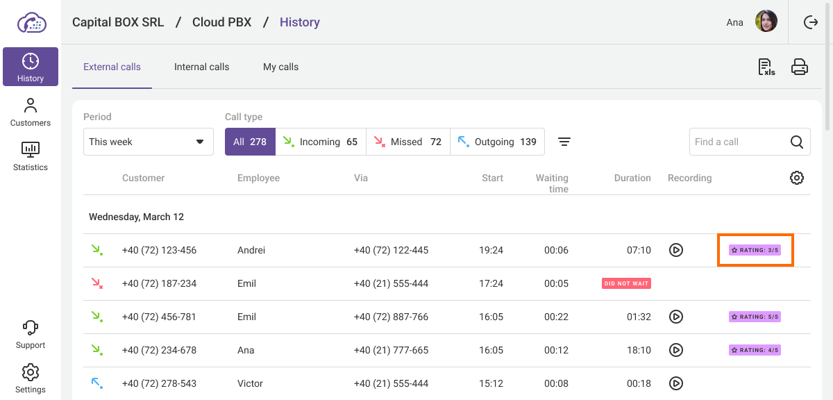 If a customer has provided a rating for the service quality, you will immediately see it in the History section. For easier analysis of the assessment, you can download files in .xlsx format.