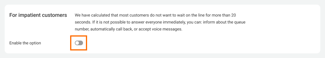 2. Find and enable the For impatient customers option at the bottom of the settings.