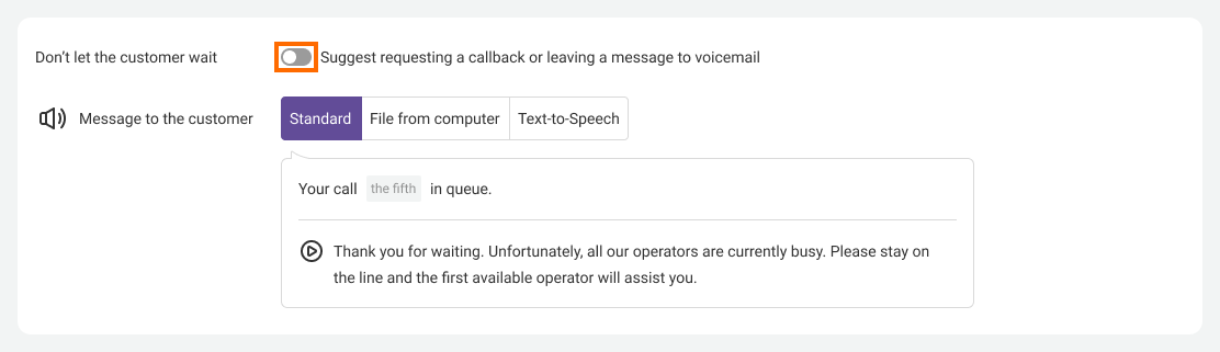 You can offer your customers to request a callback if they don’t want to stay on the line. In this case, a caller retains their position in a queue, and once one of the department employees becomes available, the system will first call the employee and then the customer.