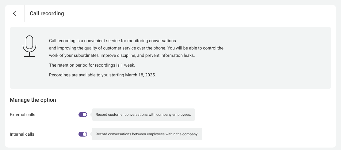 You can temporarily disable Call Recording if it is required for a special case. Please note that disabling recording in this section does not stop billing but only allows you to temporarily disable it. If you want to disable recording permanently, disable it in the Plan section.