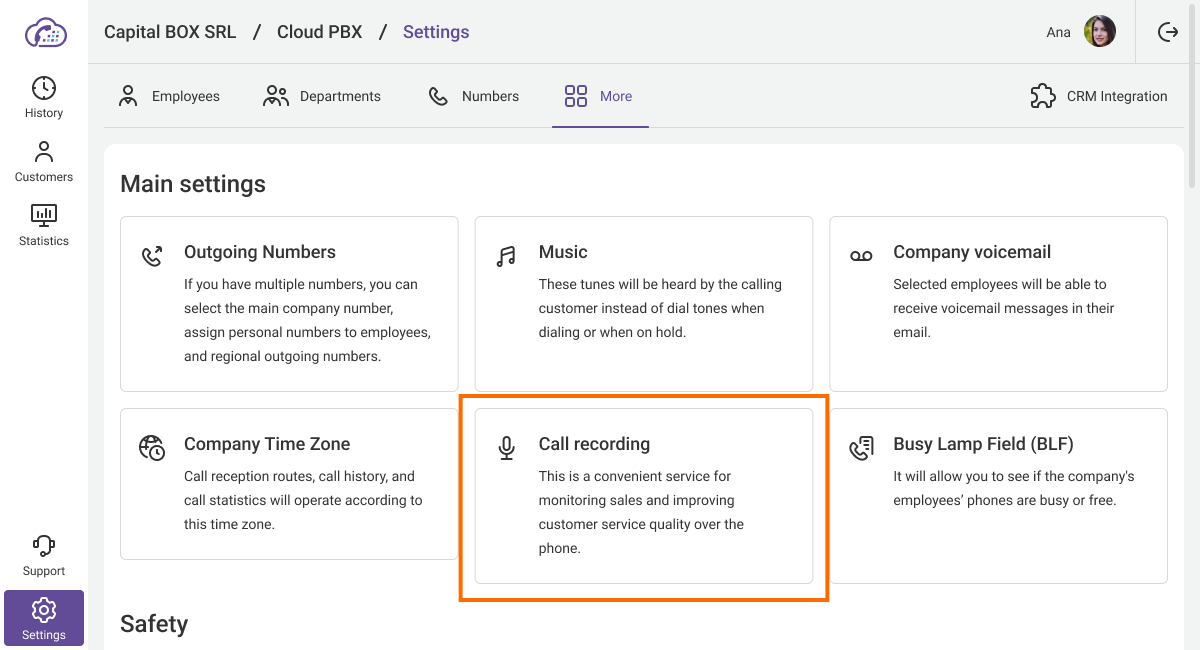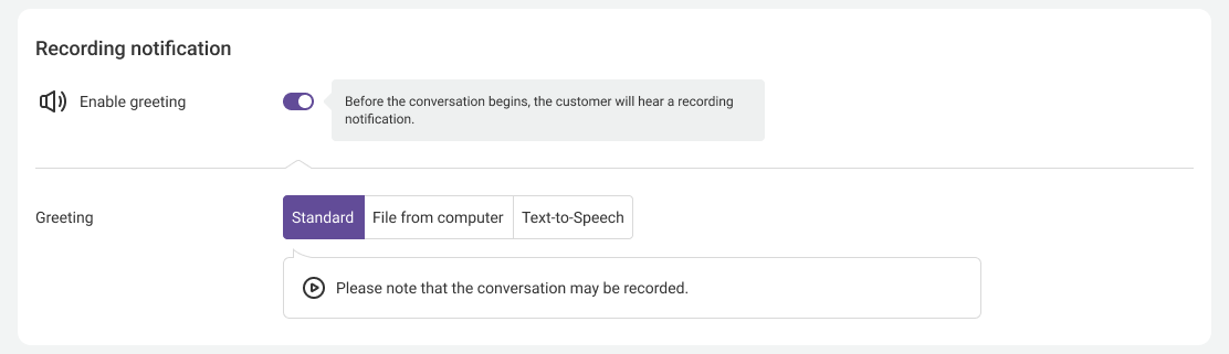 Even for outgoing calls, your customer and your employee will hear a warning about recording. By default, Cloud PBX will play a standard message, but you can replace it at any time with your file from the computer or voice the recording notification text using the Text-To-Speech feature.
