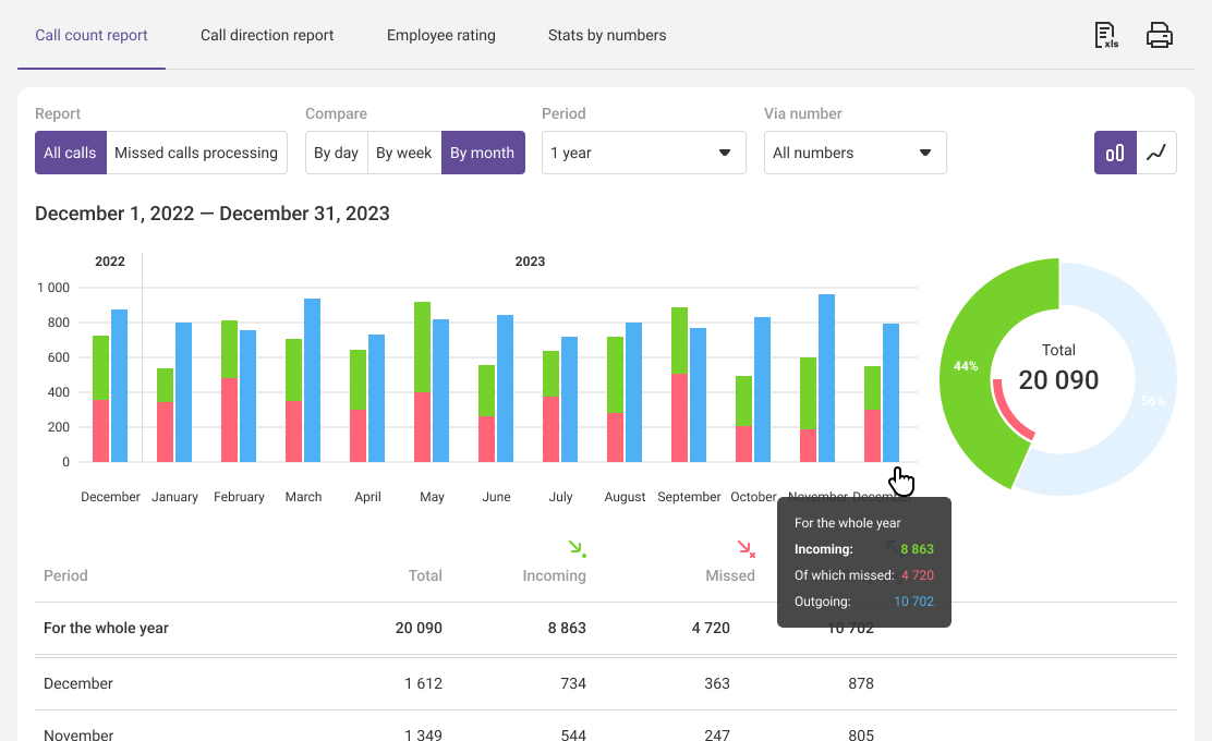 • how many calls were received or missed by employees for each of the marked numbers for the selected period;