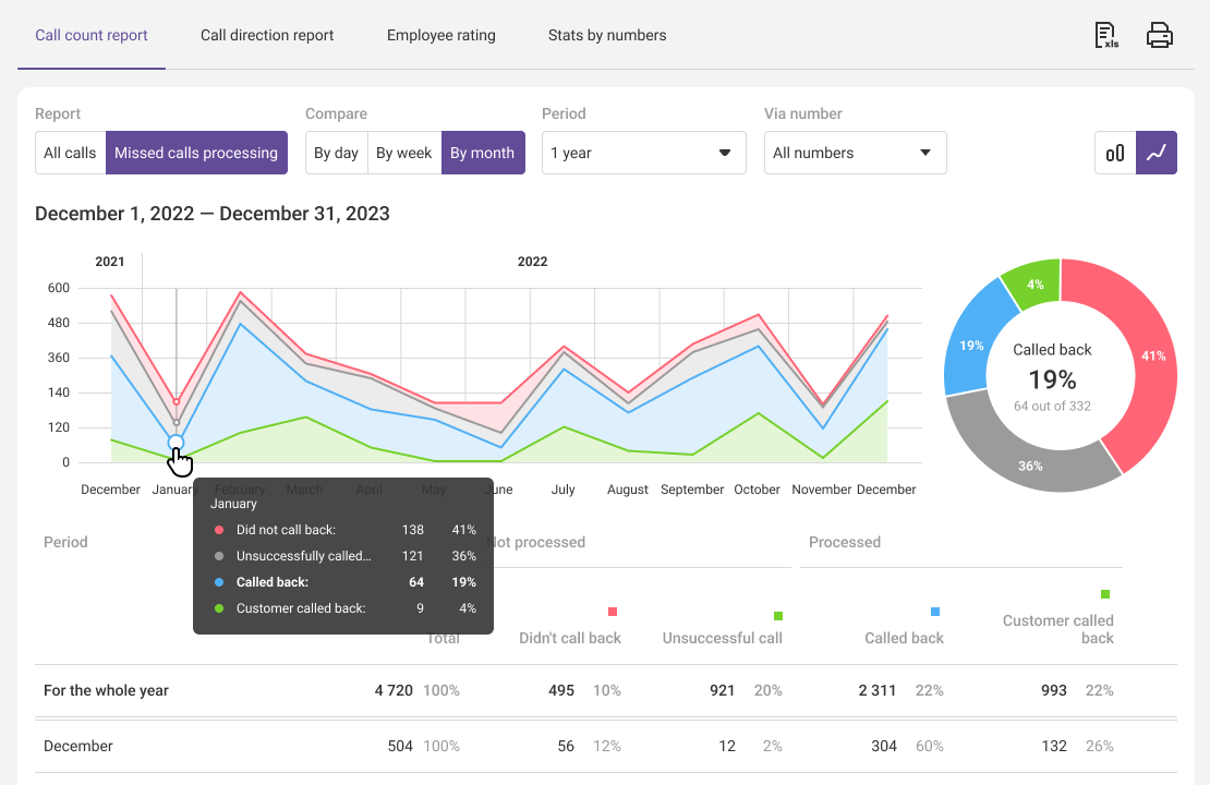 In the table below the graphs, data on all missed calls is conveniently divided into two columns indicating their status: Unprocessed (employees did not call back or did not get through) and Processed (employees called back or the customers called back themselves).
