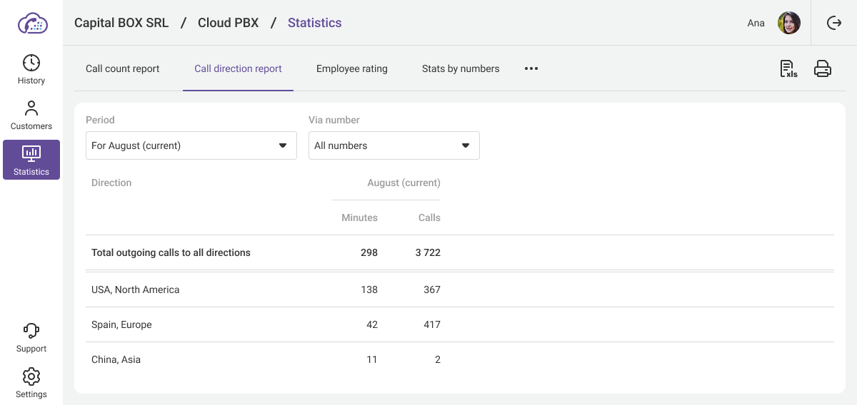 The call direction report shows where your employees call most often. It will help you predict communication costs for the upcoming months and eliminate untargeted calls (for example, if someone constantly calls to countries you do not work with). Additionally, you can adjust employees' work schedules if they have to call multiple customers located in the time zones that don't match the company time zone.