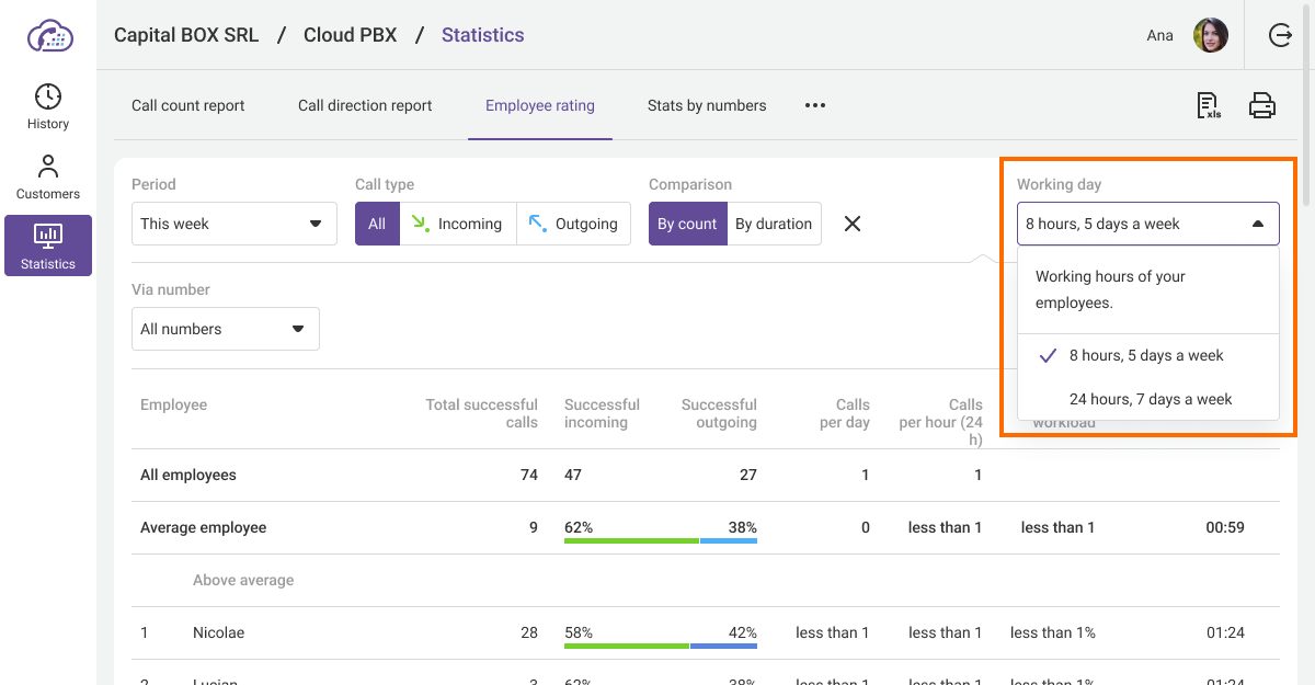 You can see call statistics for any time period and for any employee not only in the Cloud PBX web interface, but also in our convenient and free mobile application.