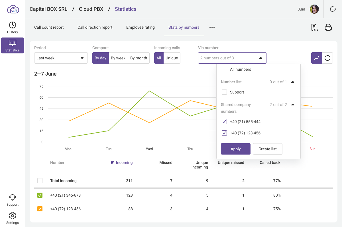 The Stats by numbers report allows you to analyze the efficiency of advertising campaigns directly in the Cloud PBX interface, with no need for connecting third-party call tracking. Select the numbers you want to compare, and Cloud PBX will show: