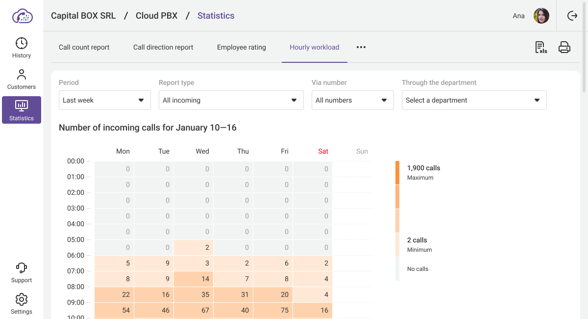 In the report, you can see the hourly workload for all calls or for different call types — incoming and outgoing (divided into successful and unsuccessful), as well as estimate the average customer waiting time on the line depending on the time of the call. See more details in the Capabilities of Hourly Workload Report article.