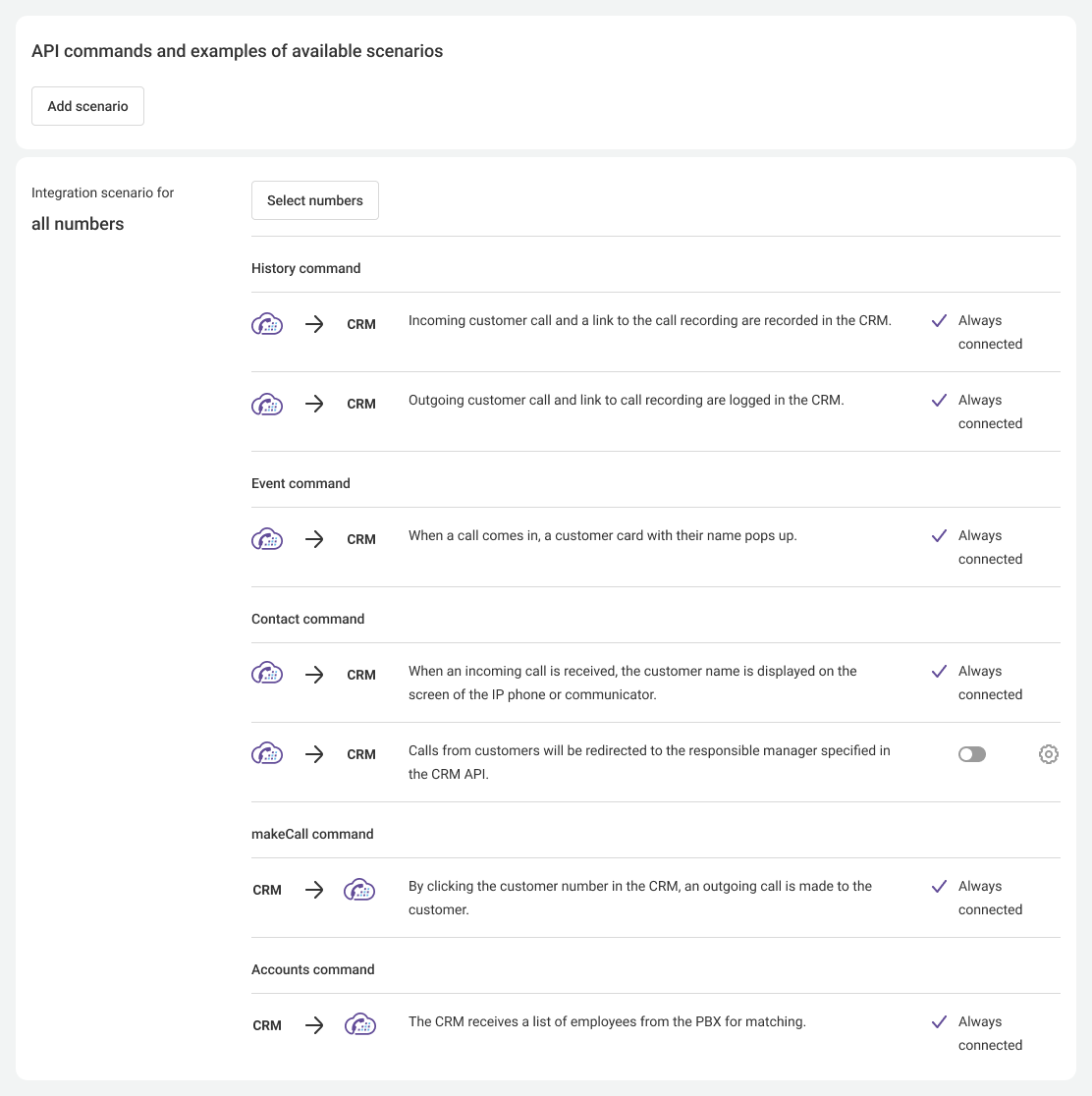 - Guide to modifying the list of numbers in integration scenarios to set up custom integration scenarios for selected numbers different from the main scenario.