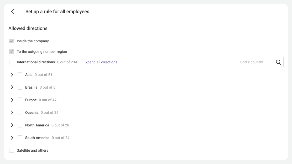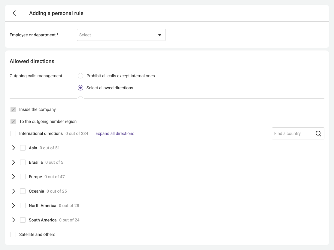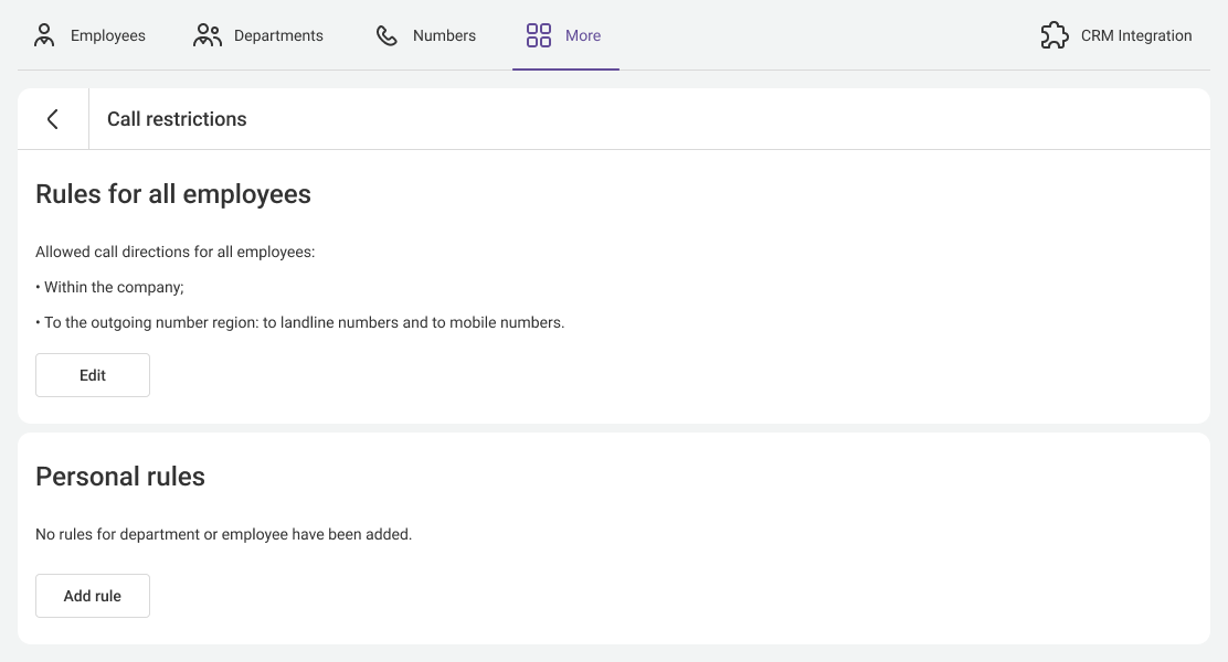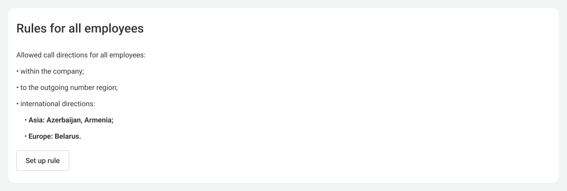 Using these rules you can allow employees to make calls to certain directions or prohibit all outgoing calls except for internal ones and the calls to the region of the outgoing number.