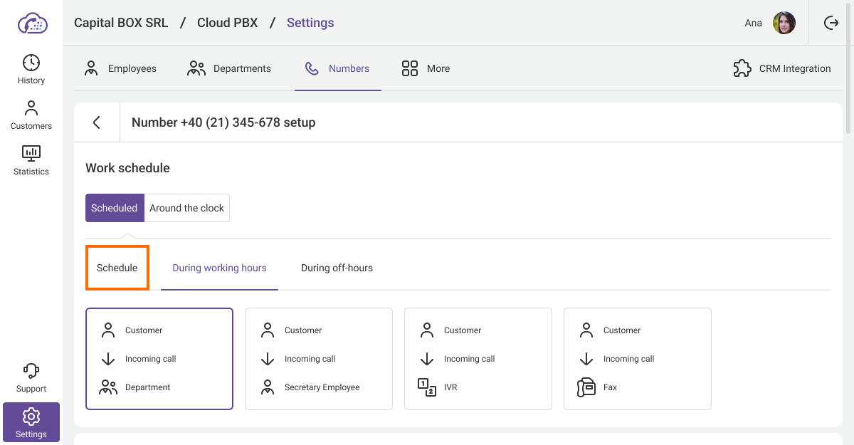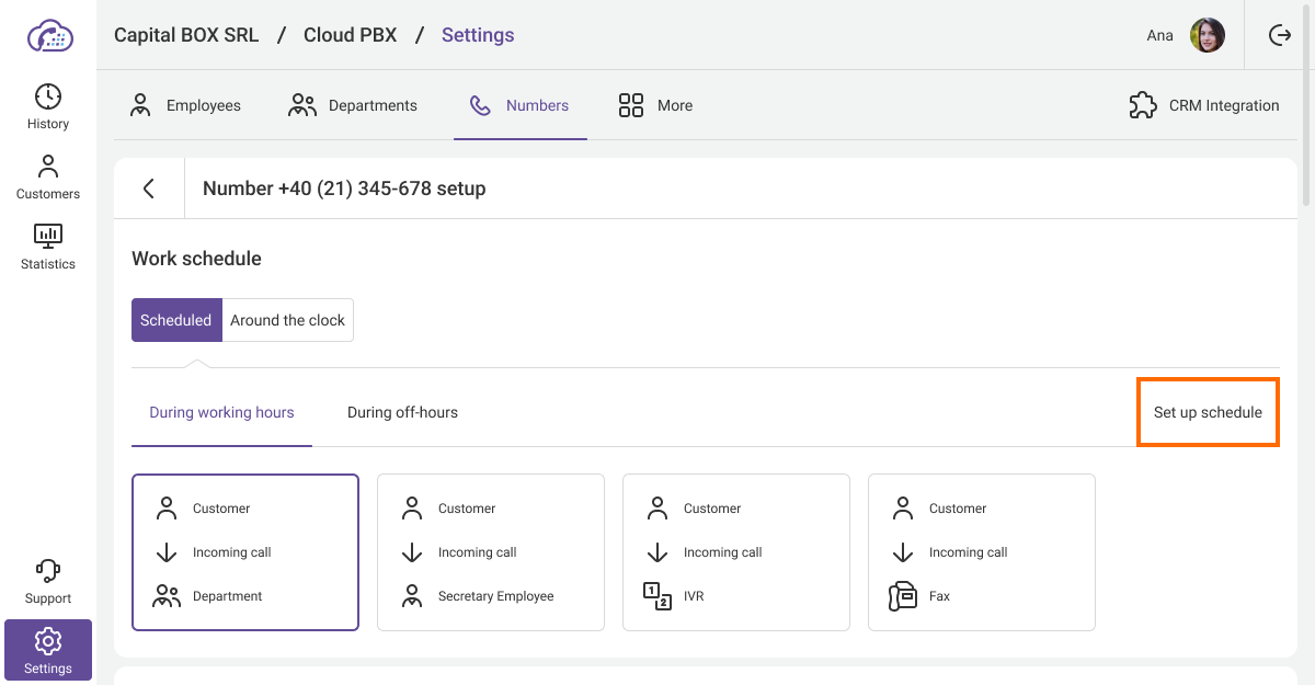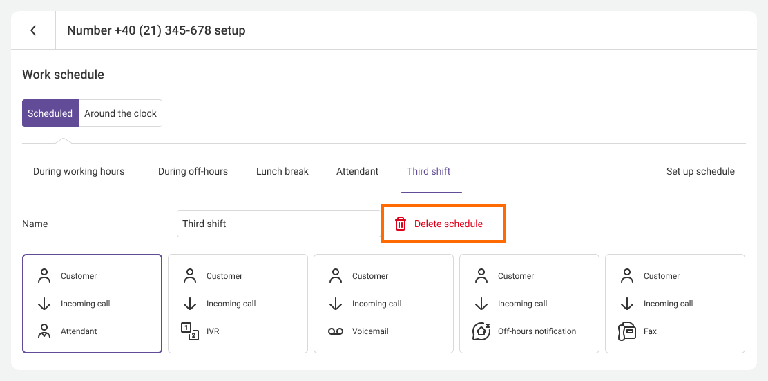 Select the number for which you need to set up a schedule. In the Work schedule section go to the Scheduled tab and click Set up a schedule.