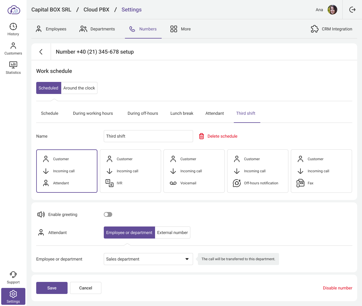 5. Now set up the calling route for your interval. To do this, go to the top of the settings screen. In the schedule options, find your option (in our example it is Third Shift) and select what Cloud PBX should do if a customer calls at the specified time: