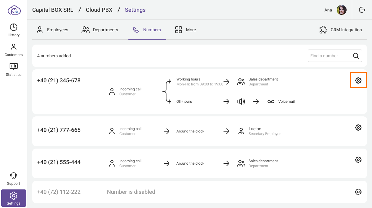 1. In the Numbers section — Shared company numbers select the number, one of the schedules of which you want to delete, and go to its settings.