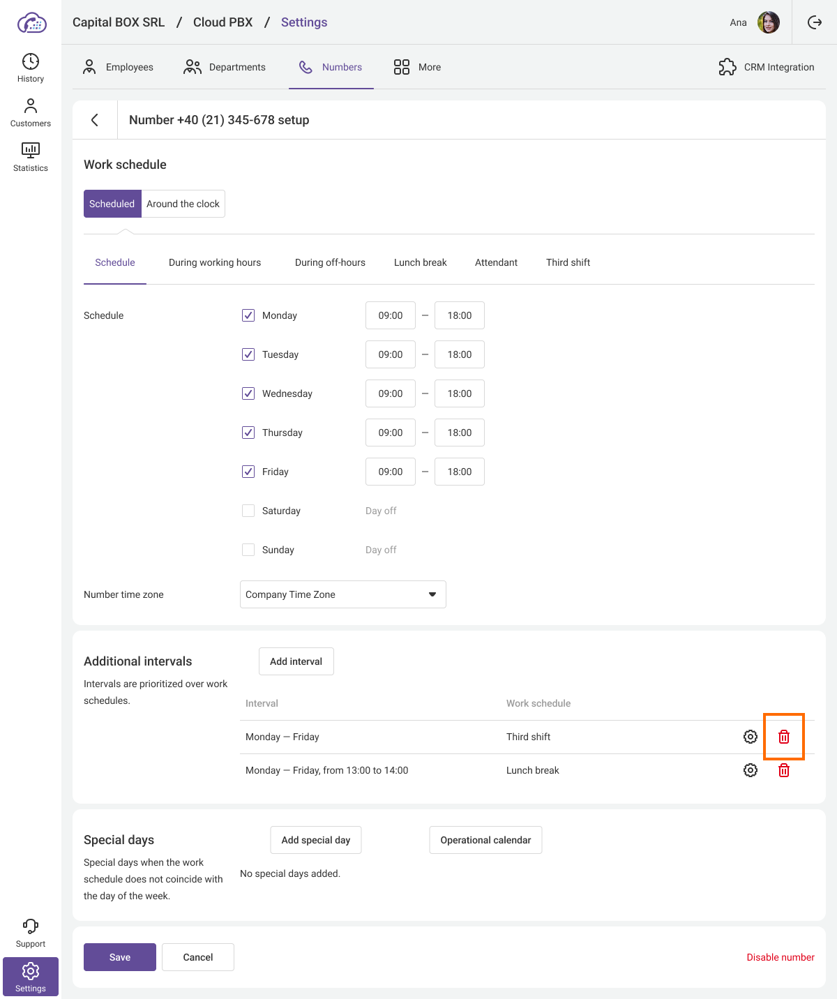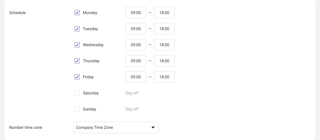By default, the schedule for each number is set in the company time zone. But if the number you are setting up should receive calls in a different time zone, specify it in the number schedule.