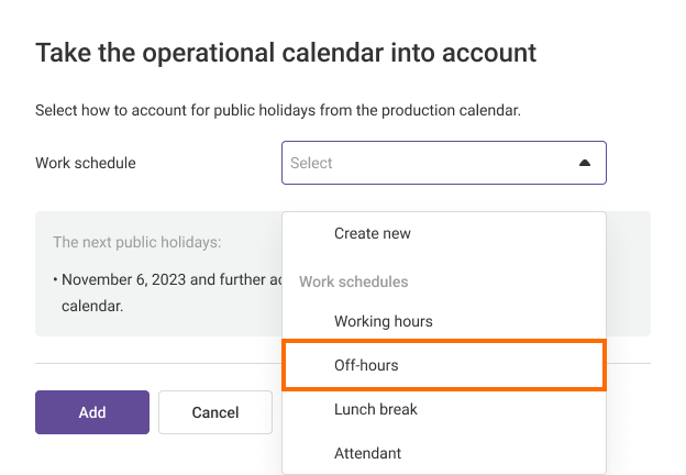 If your employees are off during public holidays and one or more of your numbers stops receiving calls, you can enable the integration of Cloud PBX with the operational calendar. Thanks to this, you will not need to adjust the schedule manually before the holidays — on the estimated dates your Cloud PBX will automatically switch the work schedule for the required numbers to off-hours.