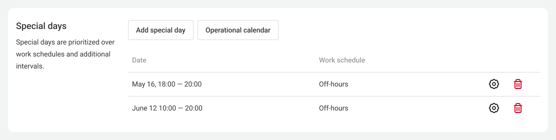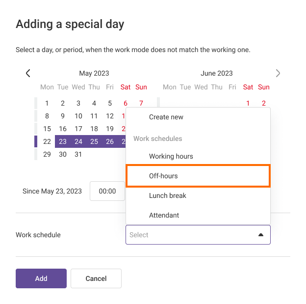 • special day — May 16 from 8:00 to 9:00. Select the work schedule for this interval — off-hours or an attendant;