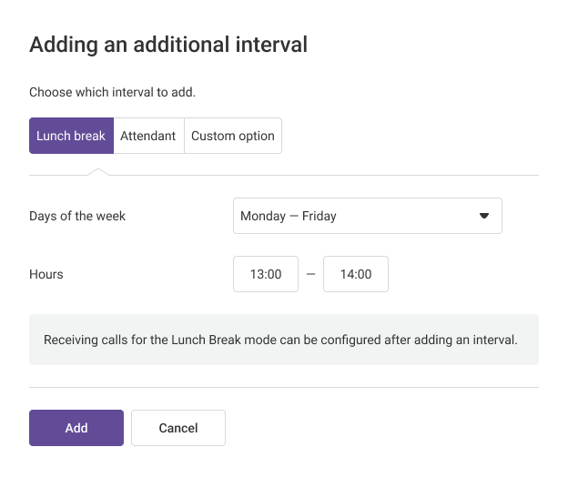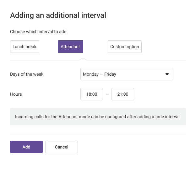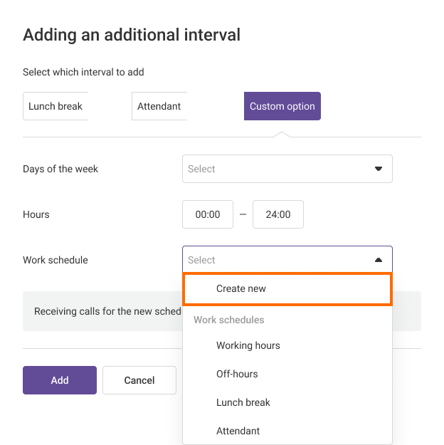 If your company work is organized in a more complex way and the correct schedule can not be created by only specifying the lunch break and attendant time, you can create your own additional interval and set up rules for processing incoming calls for it. You can have as many custom additional intervals as you like.