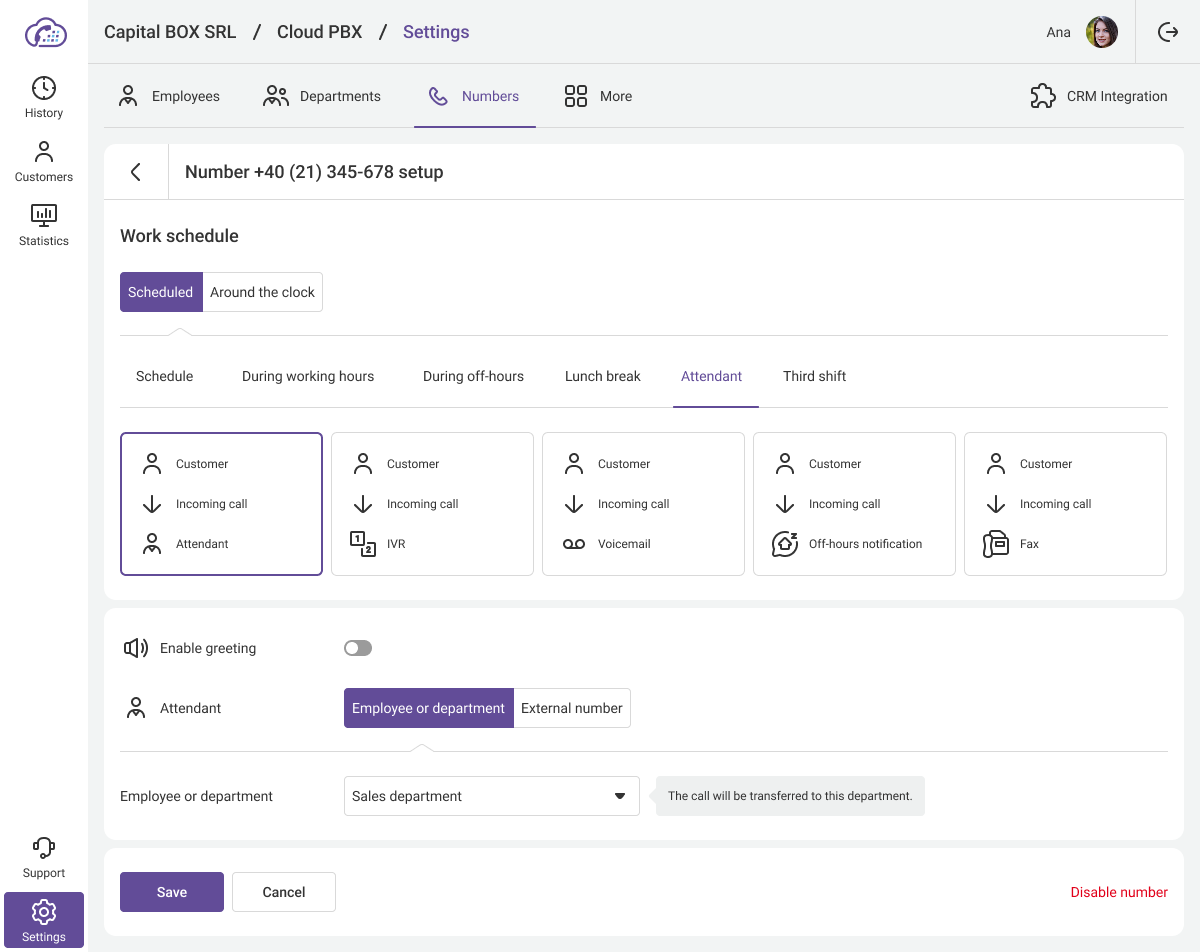 You can flexibly set up a call reception schedule for each of your shared numbers, taking into account all the specifics of your company work: working hours and off-hours, lunch breaks, attendants for off-hours, holidays and early-closing days, etc.