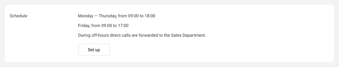 When an employee has a personal work schedule, calls are received only on those days and hours when they work. During off-hours, the employee is automatically excluded from the department call queue. If customers call them directly, such calls can be forwarded to colleagues or a voicemail. When the employee comes to work according to the schedule, all off-hours settings are automatically disabled.