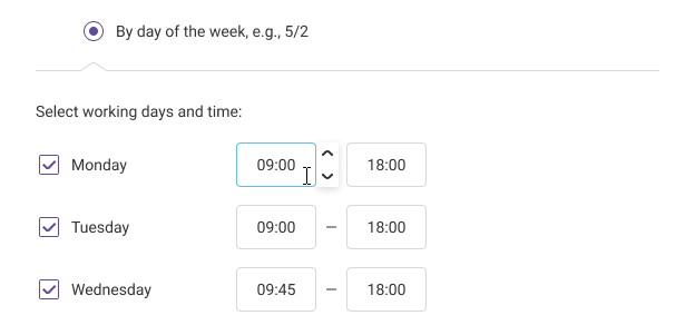 - By day of the week — this is a schedule where working and non-working days are fixed, as in a 5/2 schedule.