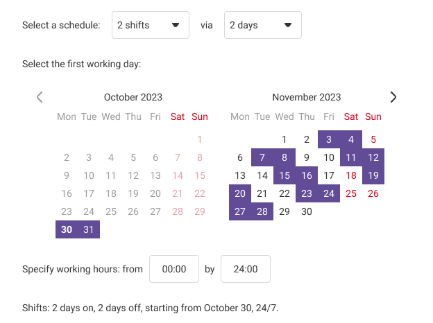 - Shifts, for example, 2 on 2 off – with this schedule starting from the selected date, two working days, and two days off alternate.