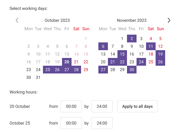 For example, if an employee works from 20:00 on October 25 to 08:00 on October 26, you need to set the working hours for October 25 as follows: from 20:00 to 08:00.