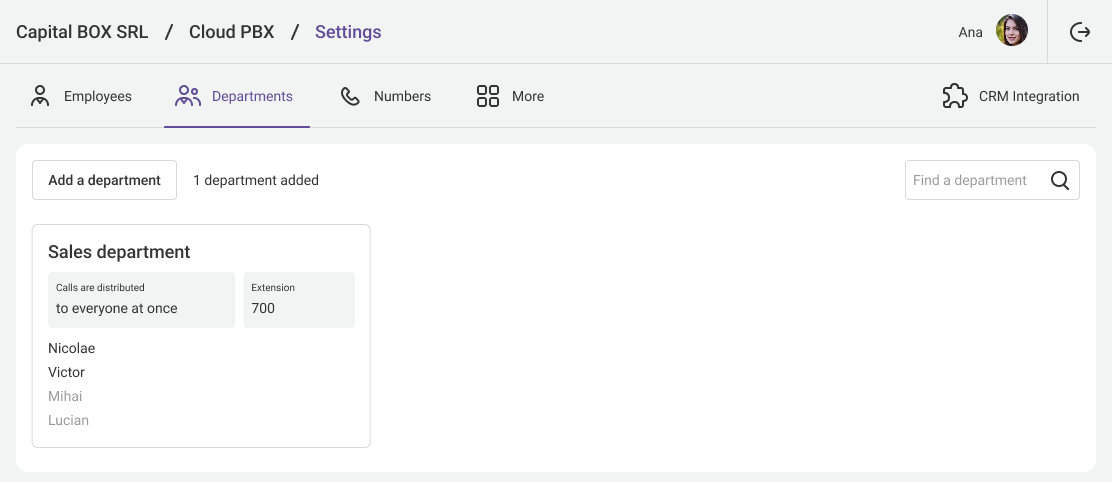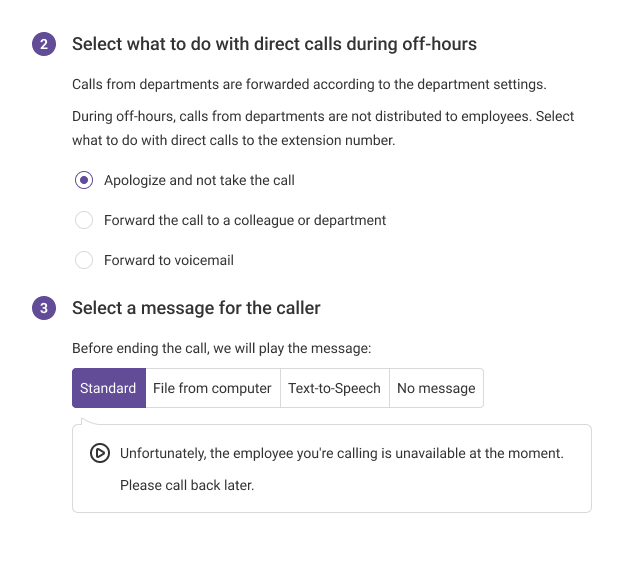 - Apologize and not take the call — if direct calls to an employee do not need to be forwarded to anyone. In this case, when a direct call happens, Cloud PBX will play a message to the customer notifying them that the employee cannot answer; after that, it will drop the call, or the customer will simply hear short beeps (you can specify in the settings which option suits you best).