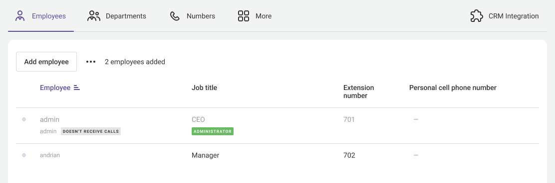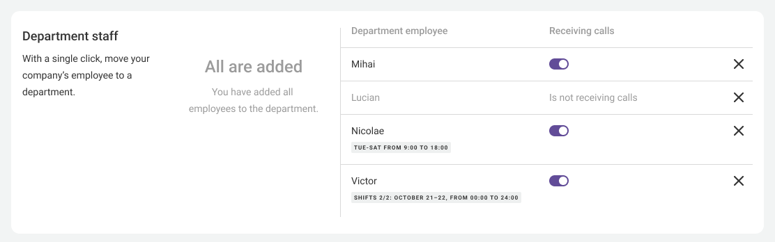 During the employee’s off-hours, a gray badge Is not receiving calls will appear next to their name on the Employees tab.