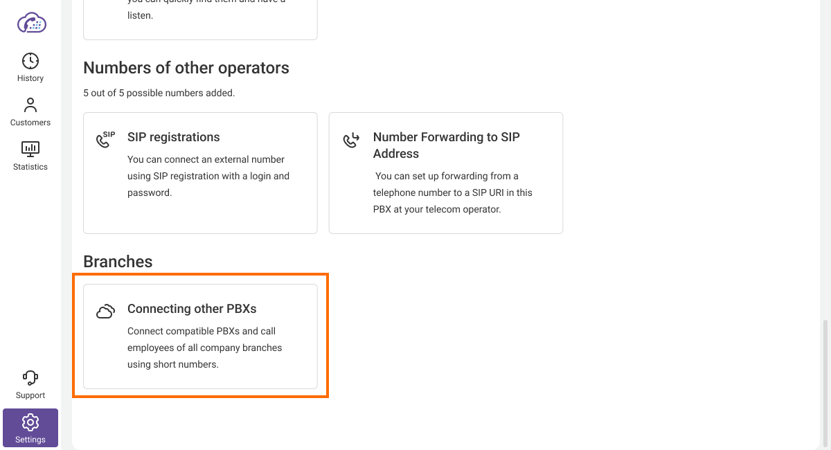 1. Go to the More section in the settings of your Cloud PBX. At the bottom of the page, find the Connecting Other PBXs section.