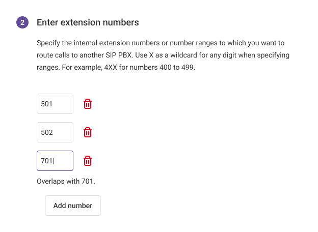 4. Specify the extension numbers of the connected PBX or their ranges so that Cloud PBX knows which calls should be sent to the connected PBX. You can add as many numbers and ranges as possible.