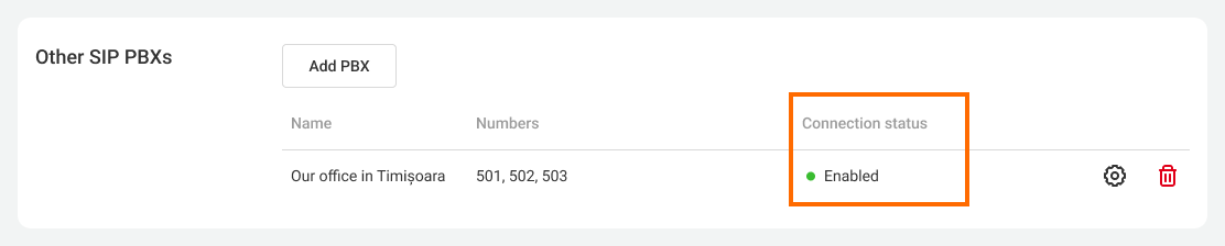 After configuring the settings, the status of the SIP PBX connection in the personal account of Cloud PBX will change to Connected and be designated with a green indicator. This means that you now have access to calls using extension numbers between users of Cloud PBX and the connected SIP PBX.