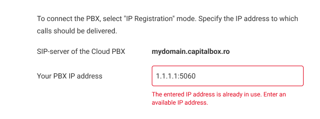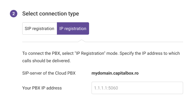 If you want to connect a SIP PBX using SIP trunking, select the IP registration connection type and specify the IP address of the PBX you are connecting to in the format 1.1.1.1:5060.