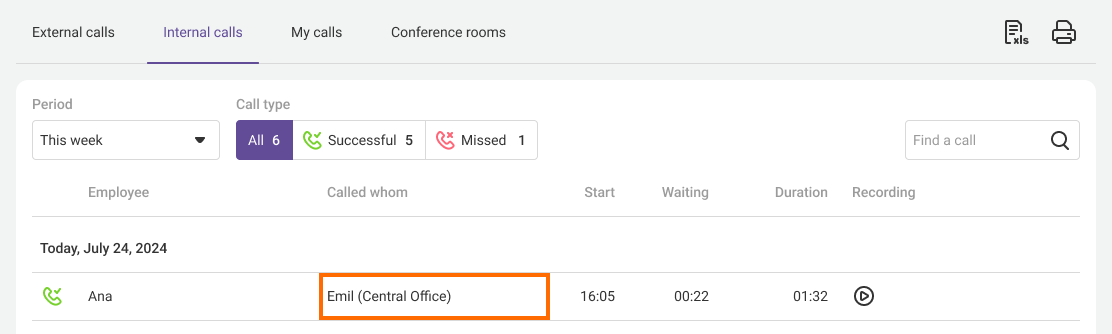Now you can make and transfer calls using the short (extension) numbers between the cloud PBX systems. Such calls will appear in History on the Internal calls tab and can be listened to. In the Called whom column, the name of the branch to which the manager belongs will be displayed in brackets.