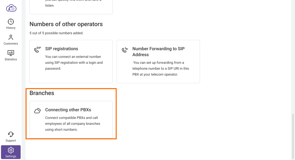 If your company has multiple branches that use separate cloud PBX systems with their own employees, departments, and independent statistics, you can connect them all into a unified telephone network with a single numbering plan.