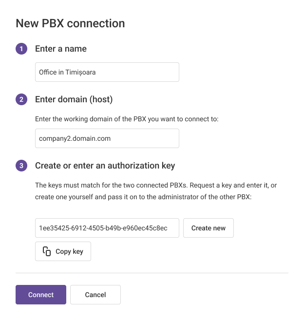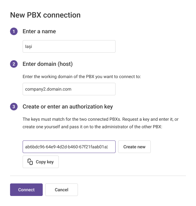 4. Go to the cloud PBX you want to add. Add the data of your first cloud PBX in the same way. Enter the authorization key that you created earlier for the first PBX.