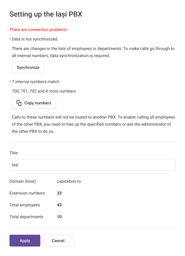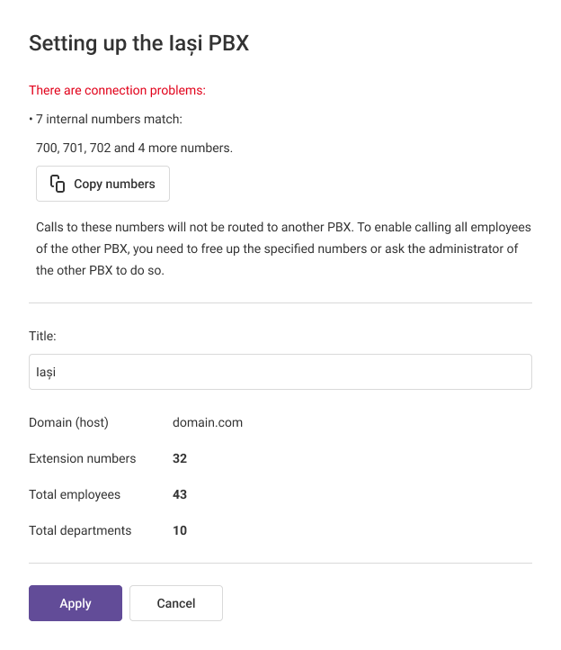 If both PBXs were initially created independently, there is a possibility of overlapping internal numbers. This will not hinder the connection of PBXs, but employees with overlapping numbers will not be reachable from the other PBX. During the connection process, the following warning message will appear: