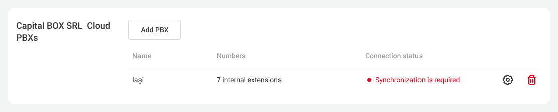 If automatic synchronization doesn't occur, you will see a Synchronize button in the connection settings of the other PBX. Click it to perform a manual synchronization.