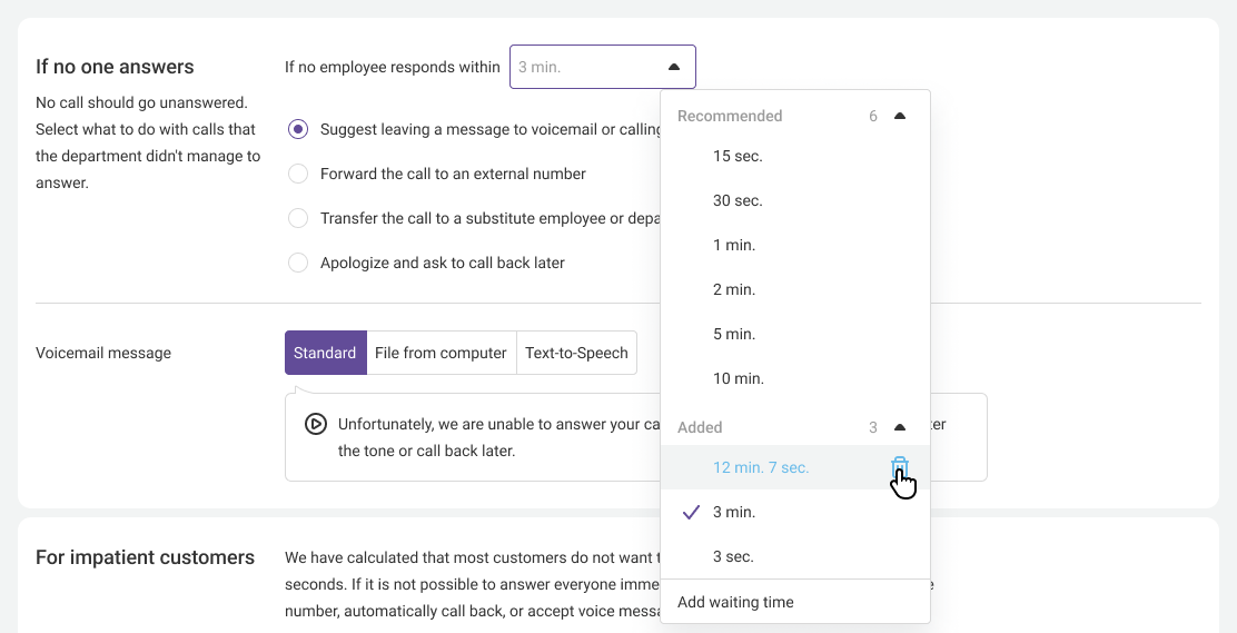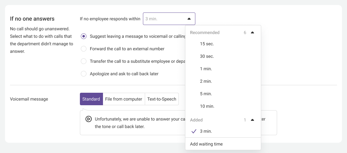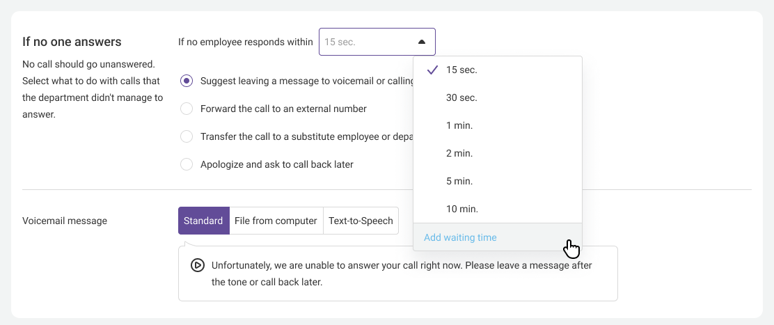 1. When setting up the waiting for response time in a department, you can select standard options or add your own intervals. To do this, in the If no employee responds within section, click Add waiting time in the drop-down list.