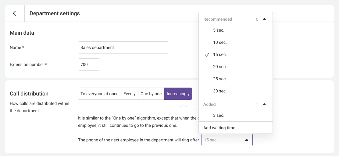 For example, in the settings of the Call distribution section with the limit of up to 30 seconds, the waiting time that we specified earlier in If no one answers ​​(3 minutes) is not displayed since this time doesn’t fit the permitted limit.